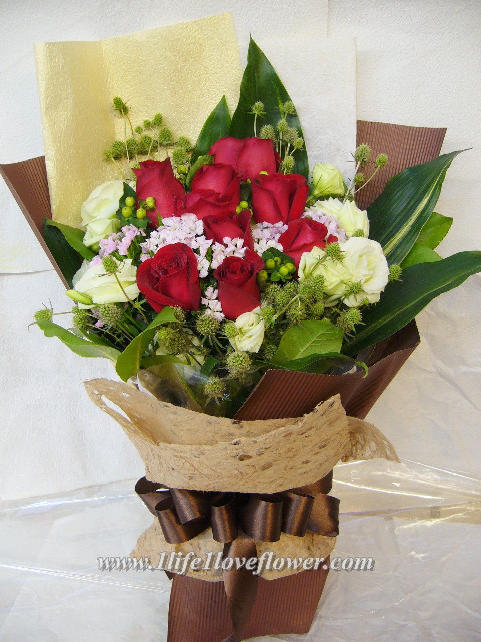 10支大頭紅玫, 配襯了歐洲的襯花, 加上比較複雜的包裝設計, 令經常收花的她有耳目一新的感覺.