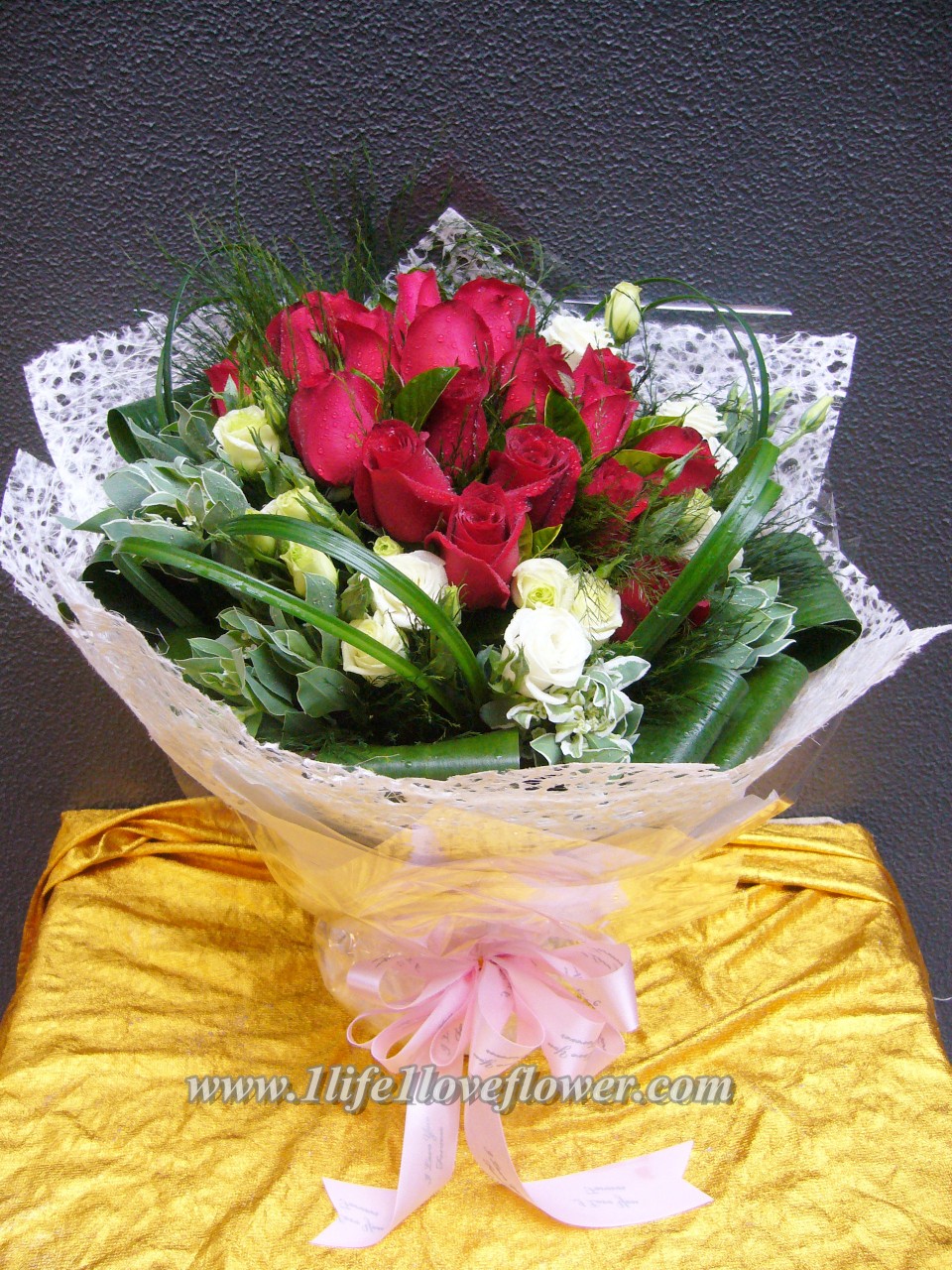 18-20枝紅玫瑰,綠桔梗, 葉上花.紅玫代表熱戀