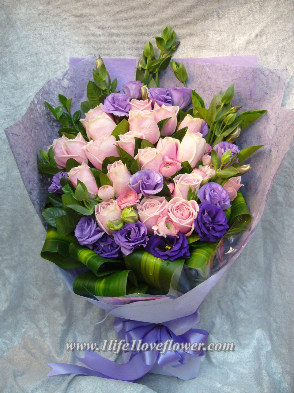 20枝馬利亞玫瑰, 粉色小牡丹(只限冬天及春天, 其他時候以其他粉色花代替), 紫色桔梗.馬利亞玫瑰是大頭玫瑰, 顏色是淺紫色與粉紅色之間, 好特別好高貴.