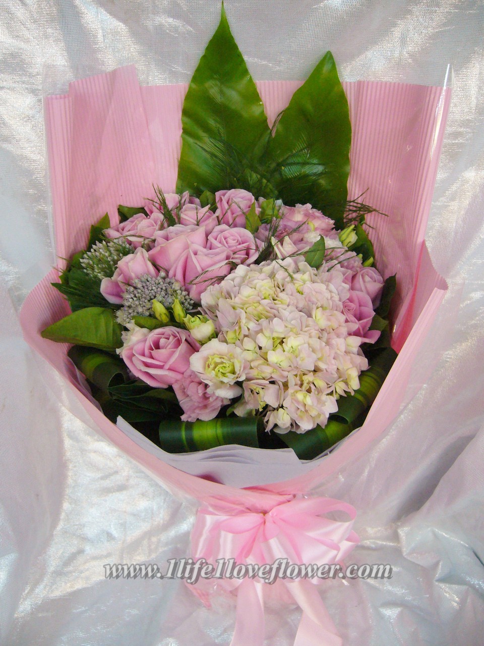 18-20枝馬利亞玫瑰, 粉色綉球,粉色桔梗, 荷蘭小蔥花(春天才有, 如需要會隨季節轉換適合的襯花)