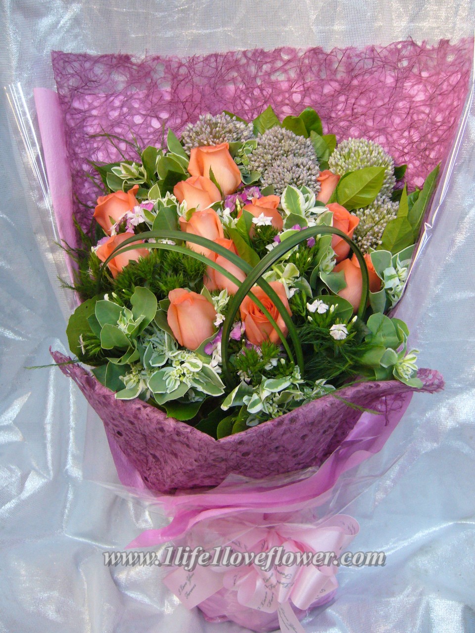 11-12枝粉玫瑰, 荷蘭蔥花(只限春天, 其他時候會以其他時花代替), 粉美女, 葉上花. 粉玫代表愛的宣言, 初戀.