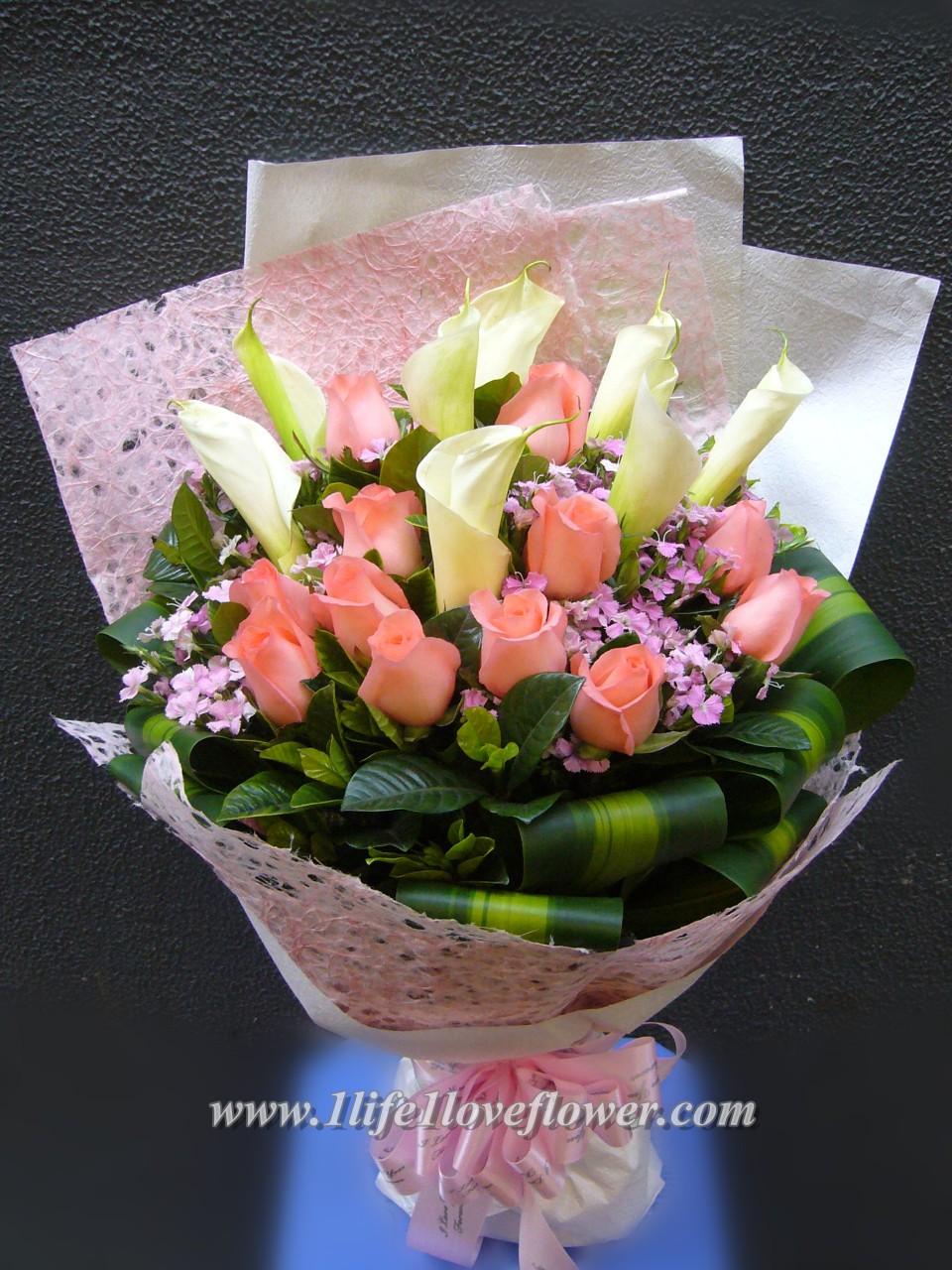 8支白色馬蹄蘭(只限春天), 12枝粉玫,粉美女英. 白色馬蹄蘭代表清春活力, 粉玫是愛的宣言.