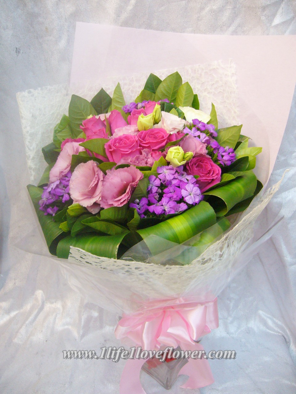 11支桃紅玫瑰, 桃紅色俾人熱情既感覺, 加左粉色桔梗, 粉美女英配襯, 令花束更優雅.