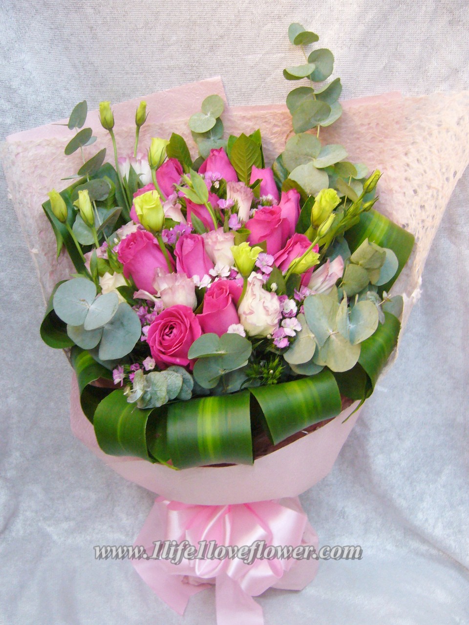 12枝桃紅玫瑰, 粉白桔梗, 粉美女英.桃紅玫瑰是比較熱情的顏色, 配襯淺粉的桔梗加入一點少女的元素, 很適合年紀輕的活潑女孩.