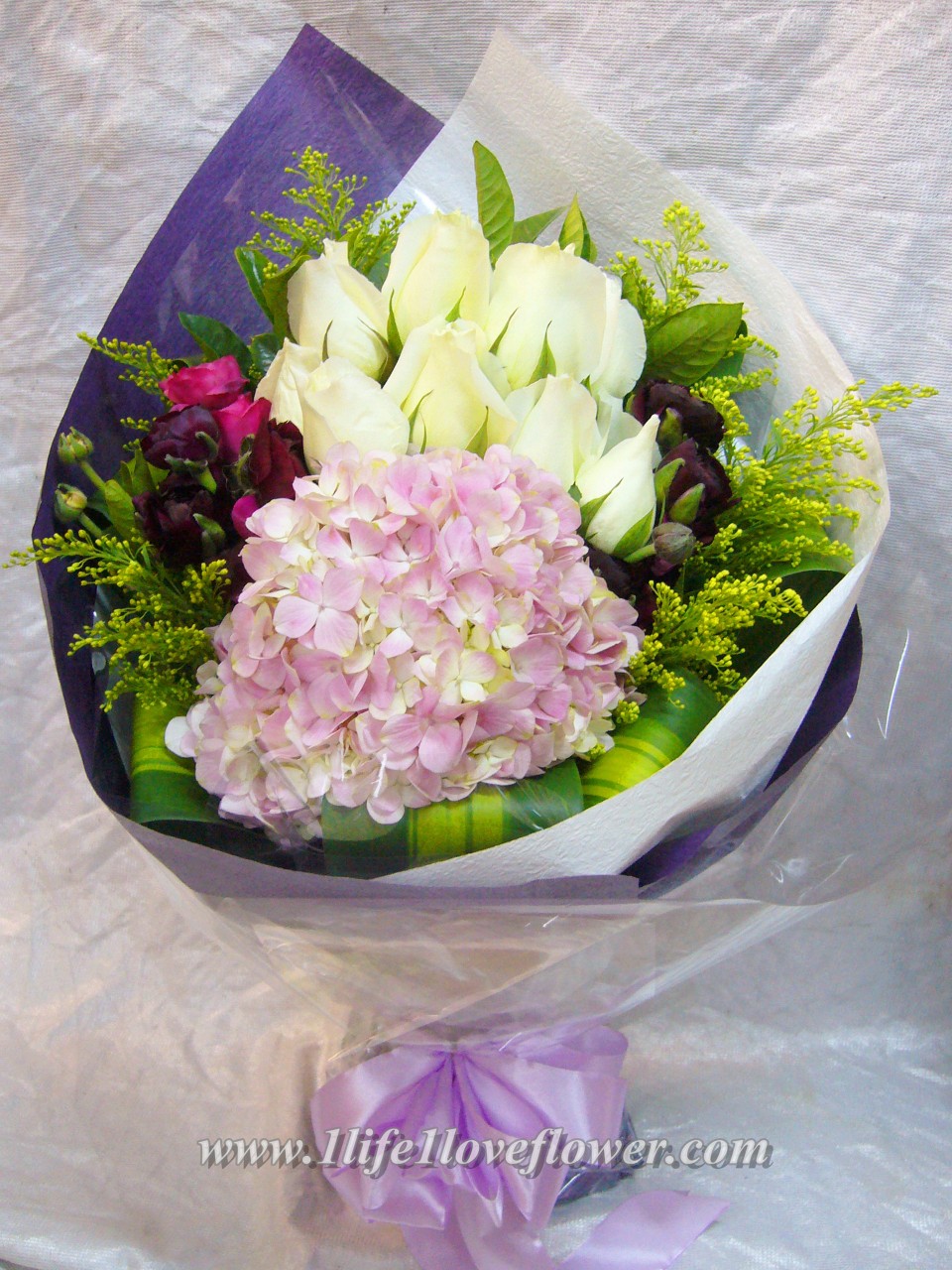 9枝白玫, 粉紅色琇球花加小牡丹. 白玫代表純潔, 綉球花有圓滿既意思,小牡丹代表幸福.