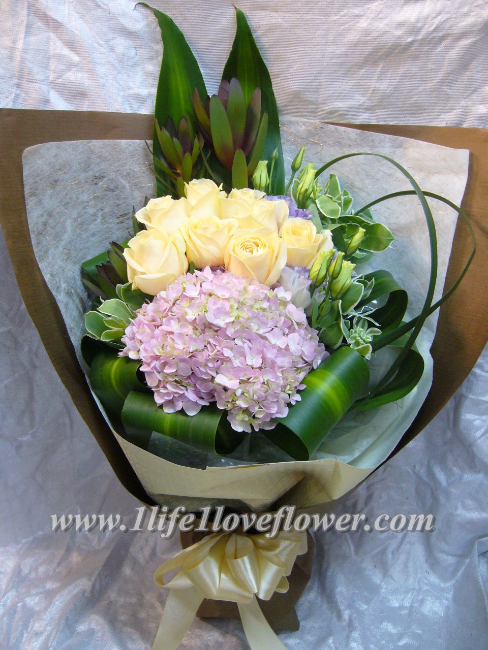 12支蜜桃雪山, 襯綉球及桔梗, 襯葉, 感覺清新.
