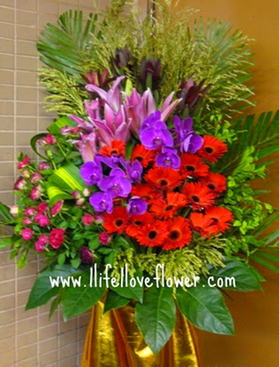 保證材料包括兩支蝴蝶蘭, 太陽花15-20朵, 小玫瑰8-10支,木百合5支, 火百合2支, 由於高樑貨少多數由其他葉類代替.