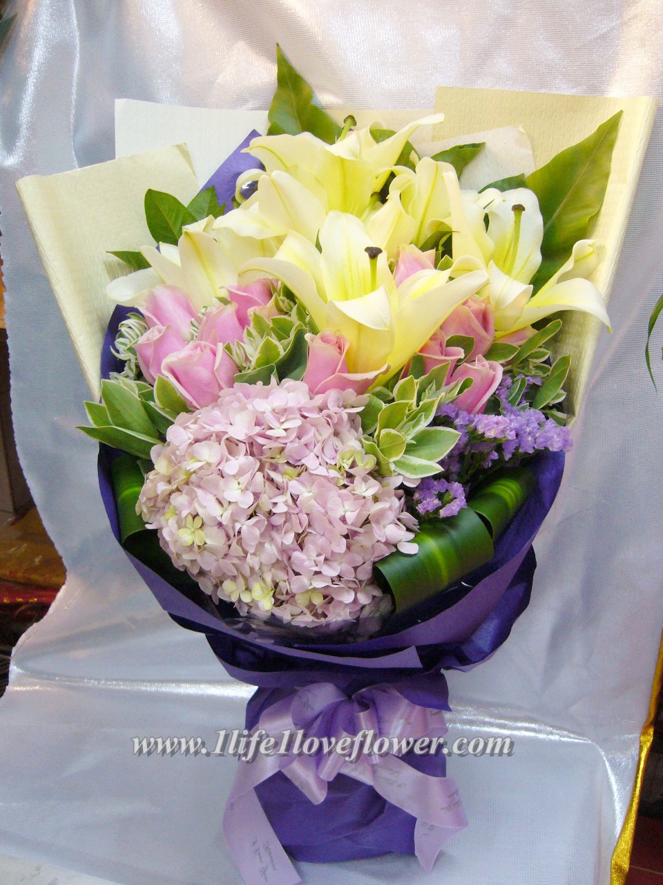 黃百合, 馬利亞玫瑰8-10支, 綉球花1支