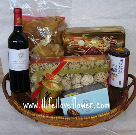1430元:月餅紅酒禮籃:美心雙黃白蓮蓉月餅或奇華雙黃白蓮蓉月餅一盒, 法國紅酒一樽, 第一鮑魚一罐, 深海螺片一斤, 日本花菇一斤, 鐵觀音一盒, 歐洲朱古力一盒