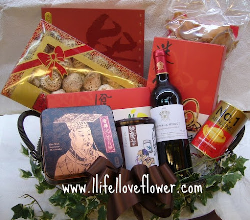 1780元: 好事成雙月餅禮籃: 美心雙黃白蓮蓉/奇華雙黃白蓮蓉/奇華花旗蔘月餅三選二, 奇華合桃酥一盒,鳳梨酥一盒, 鐵觀音一盒, 法國紅酒一樽, 第一鮑魚一罐, 深海螺片一斤, 日本花菇一斤