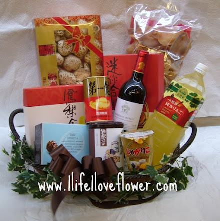 1950元,月餅海味零食籃: 美心雙黃白蓮蓉或奇華雙黃白蓮蓉一盒,godiva milk carres 16 pcs 1盒, 第一鮑1罐, 深海螺片一斤, 日本花菇一斤, 鐵觀音一盒,奇華合桃酥一盒, 奇華鳯梨酥一盒, 歐洲朱古力一盒, 法國紅酒一樽, 日本果汁一樽, 日本小食一盒.