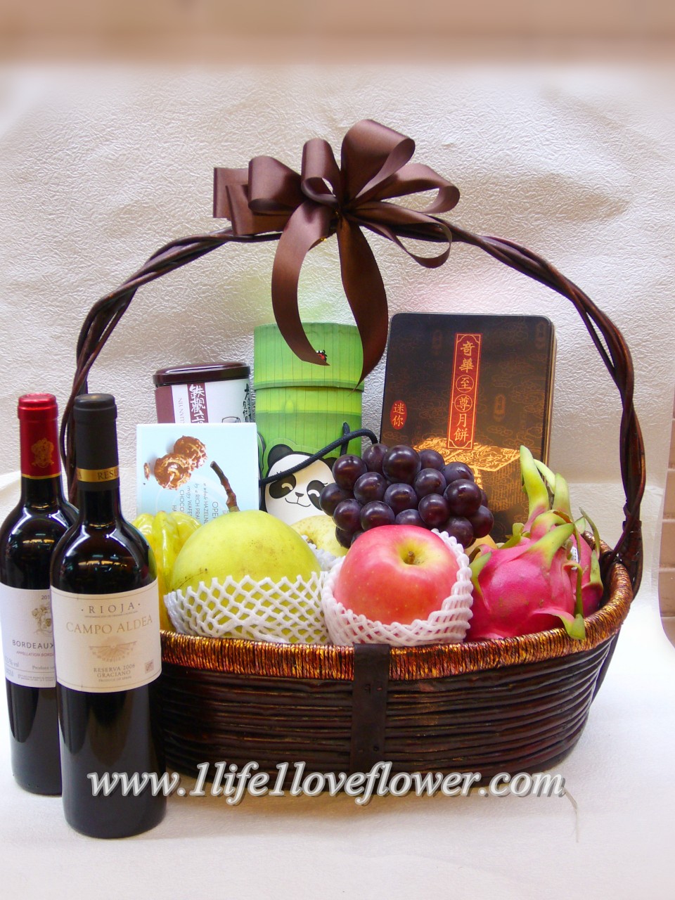 1430元: 水果禮品籃:奇華雙黃白蓮蓉或美心雙黃白蓮蓉1盒, 奇華熊貓仔月餅1樽, 法國紅酒1樽, 歐洲朱古力1盒, 鐵觀音茶葉1盒.