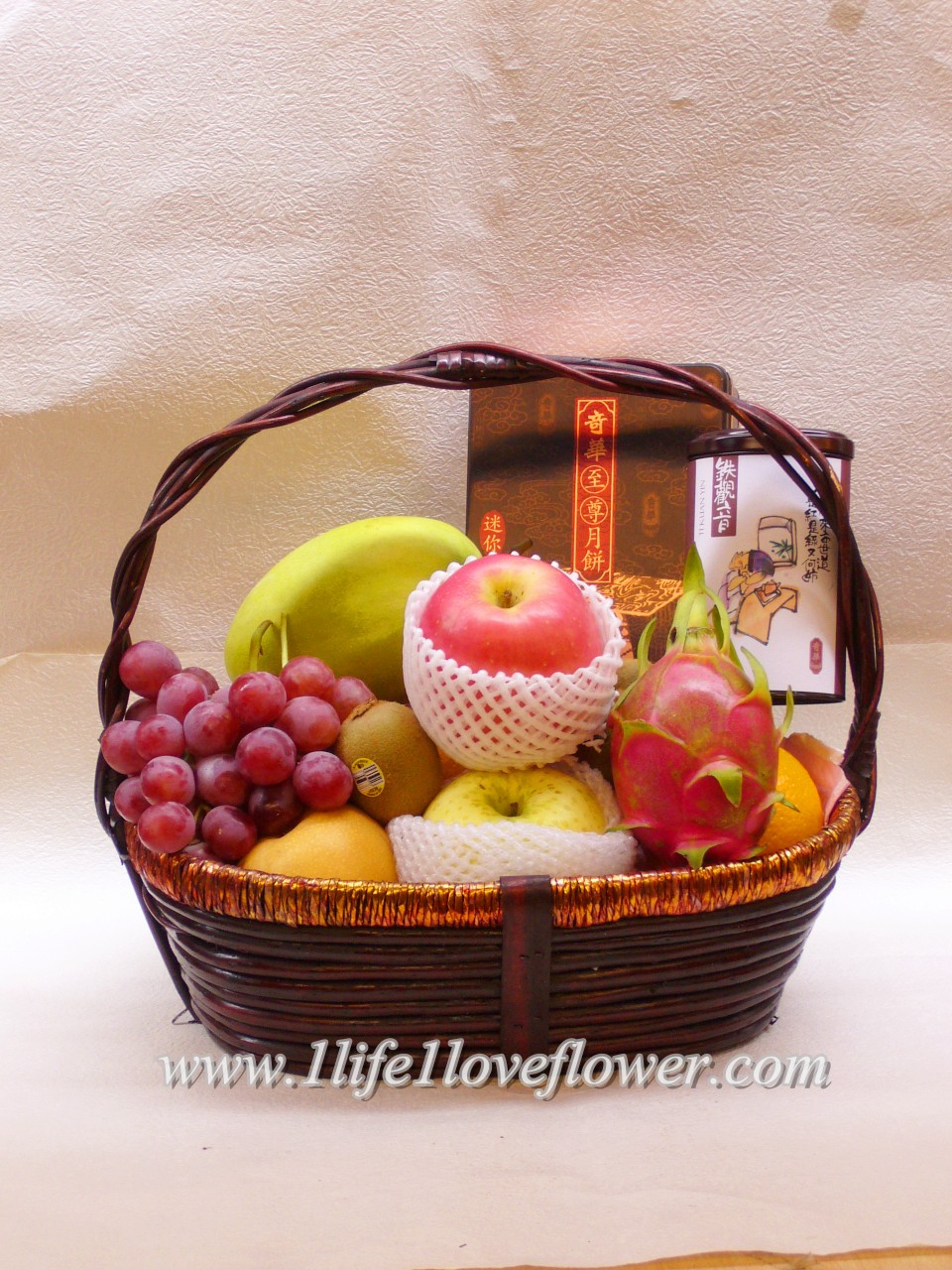載入中...請稍候...禮品水果籃: 奇華雙黃白蓮容或美心雙黃白蓮蓉月餅1盒, 鐵觀音1盒